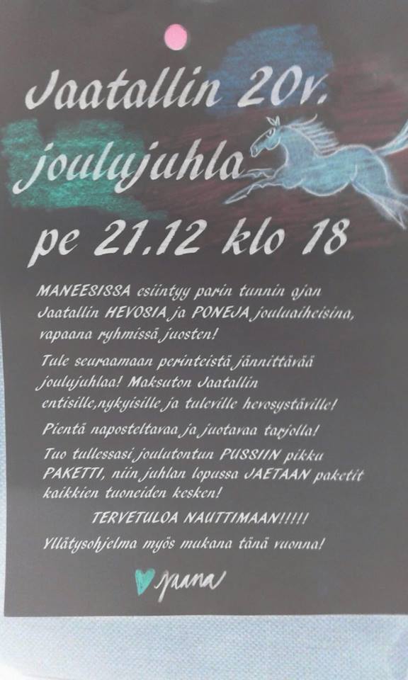 - 26.3.2017 Jaatallilta kävivät kilpailemassa Aulangon ratsastuskoululla tuntsaricupin 1.osakilpailussa Ada Helkalla 60cm ja Meeri Pumpulilla 60cm ja 80cm. Ada upeasti luokkavoittoon 60cm!